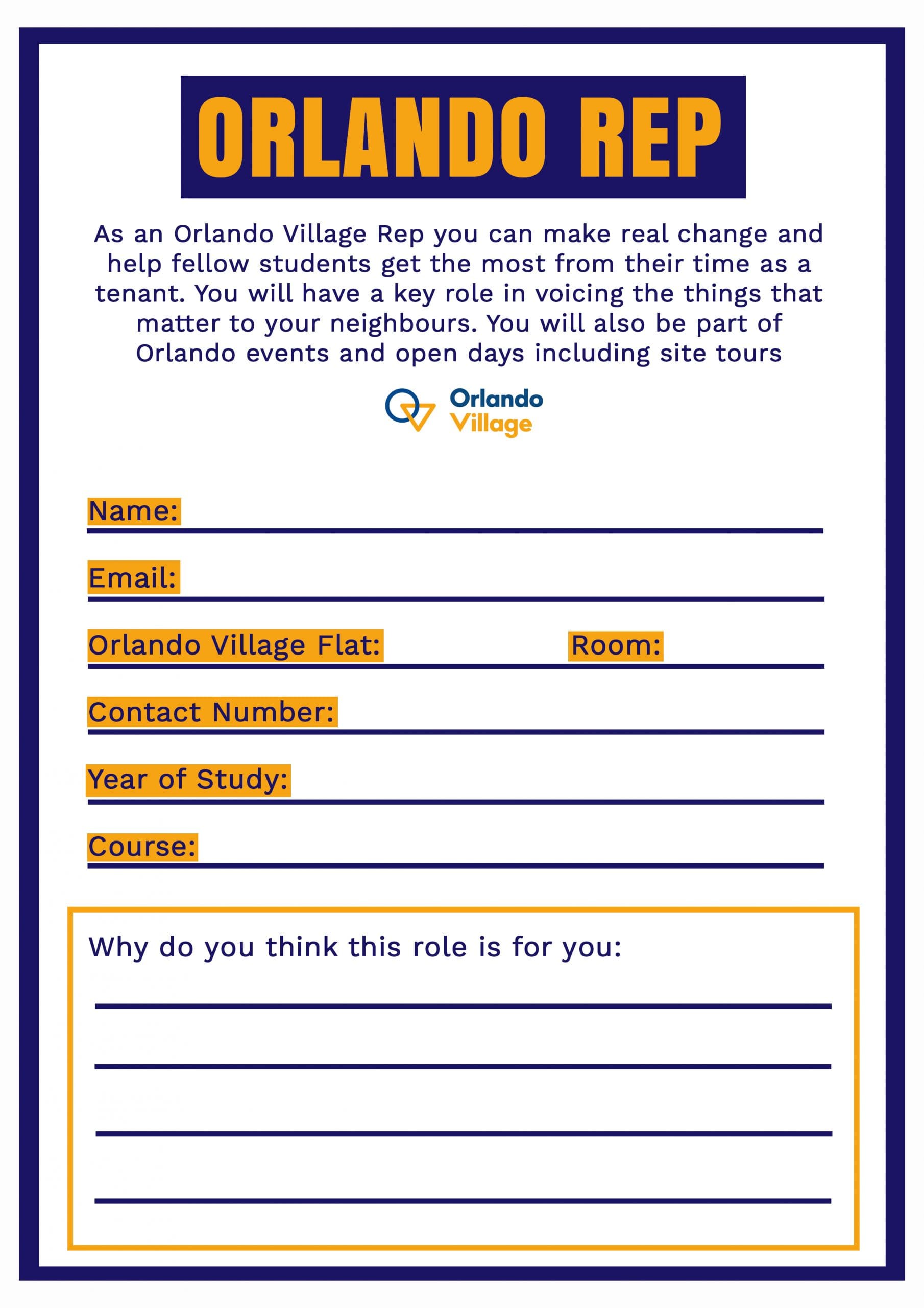 The person who takes on the role of Orlando Village Rep enjoys meeting new people and is confident to encourage others to get involved. Answering questions and offering help is a key part of the role. They are always eager to help, especially when new students are moving in and they could potentially feel intimidated by their new environment. Orlando reps also get the opportunity to get involved in exciting projects and assisting staff to host events and tours for our students.
